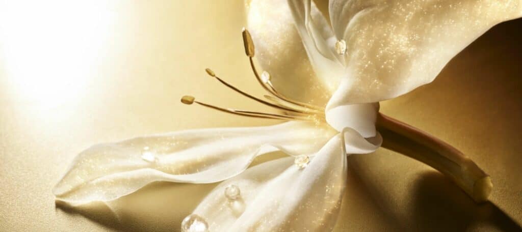 Light diffused through mountain air. A flower that survives where nothing should. Simon Escourbiac shoots the Re-Nutriv Ultimate Lift Regenerating Youth Eye Crème campaign around the Precious Gentian, the rare survivalist flower at the heart of the formula. Luminous petals catch gold, crystal droplets rest on translucent surfaces, the ingredient elevated to icon. The set constructs a world where science and nature are indistinguishable. Skin is strengthened. The flower endures.