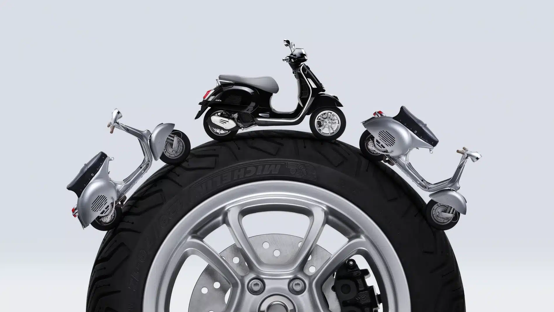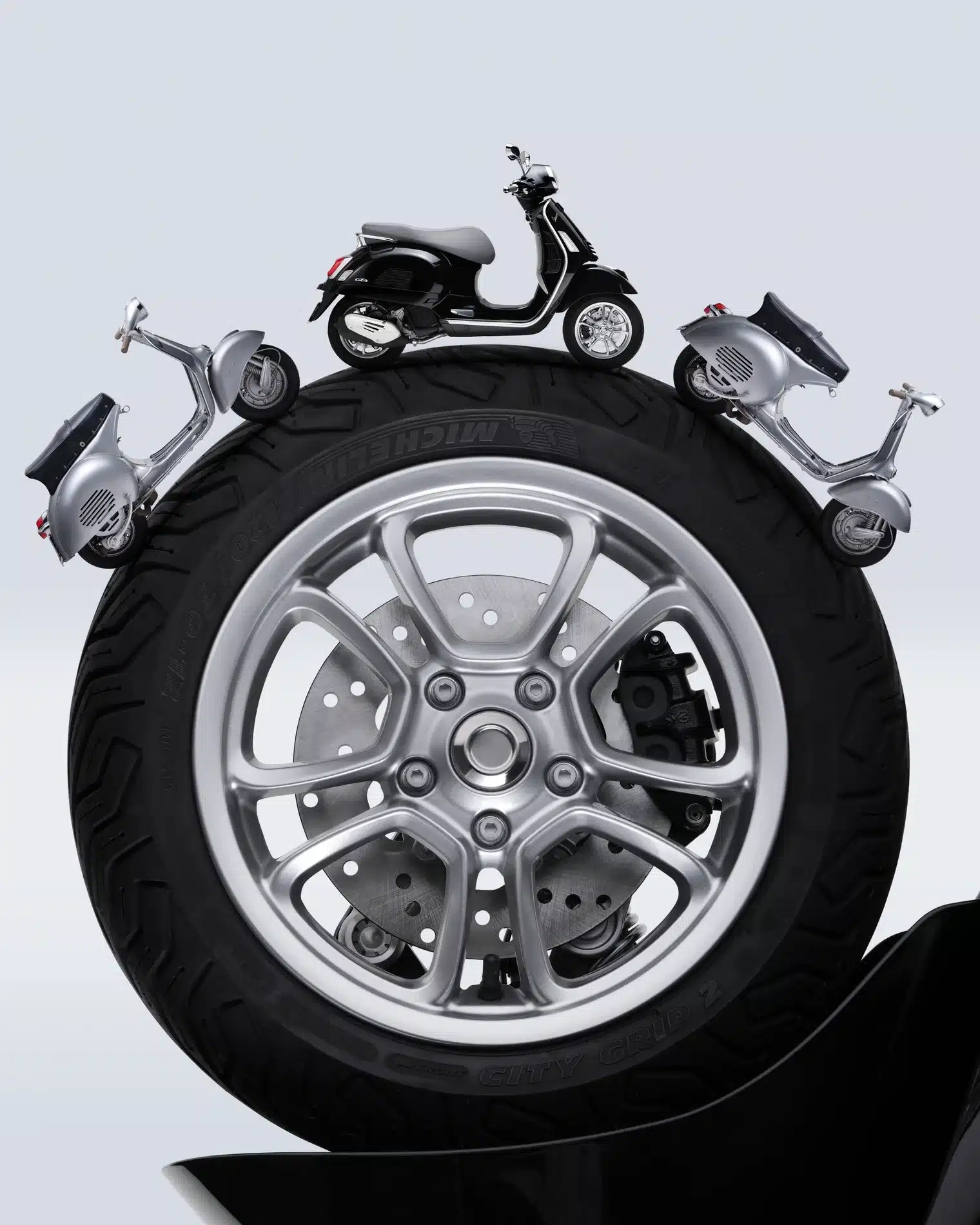 Alessandro Sorci approaches the Vespa the way a sculptor studies a finished form. The scale shifts constantly. Tiny scooters orbit a giant wheel. A helmet becomes a monument. Details of chrome and bodywork fill the frame like abstract architecture. Sorci finds new geometries in an object that has barely changed in seventy years, and that is precisely the point. The Vespa has been a design icon since 1946. What Sorci understands is that timelessness is not about standing still. Shot against pale, minimal backgrounds, his images give one of the world's most recognisable silhouettes the visual language of contemporary photography. Ancient and absolutely current.